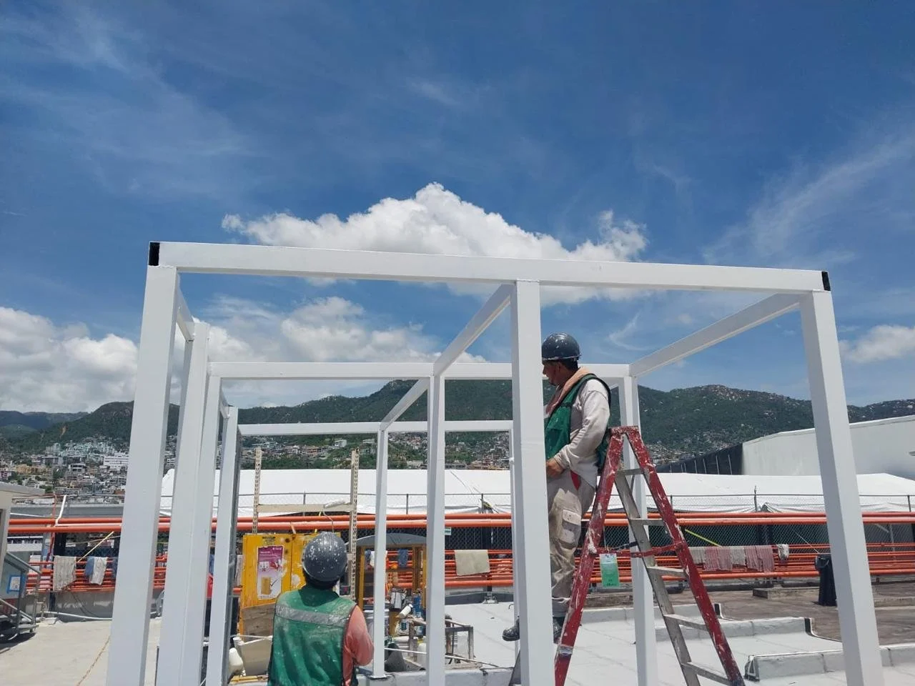 Dos trabajadores en un sitio de construcción al aire libre, uno en una escalera y otro de pie, trabajando con estructuras blancas y un fondo de montañas y cielo nublado