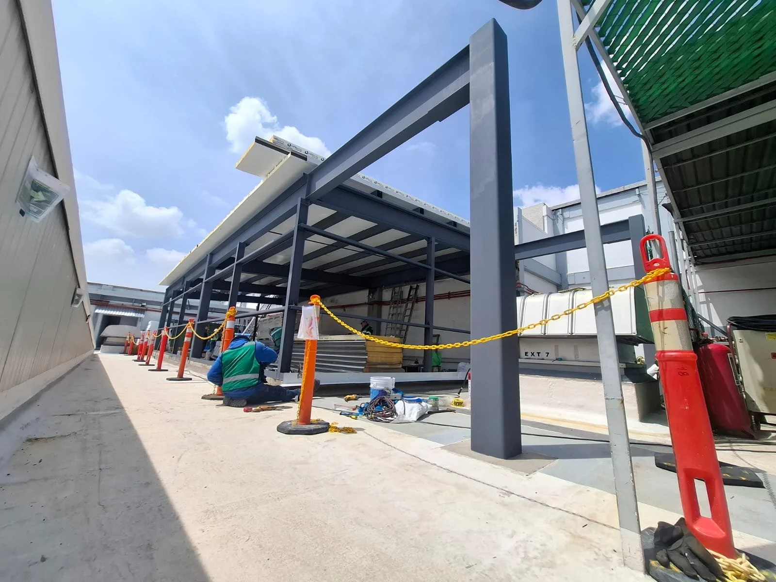 Personal de construcción trabajando en estructura metálica en un sitio de construcción al aire libre con cielo despejado.