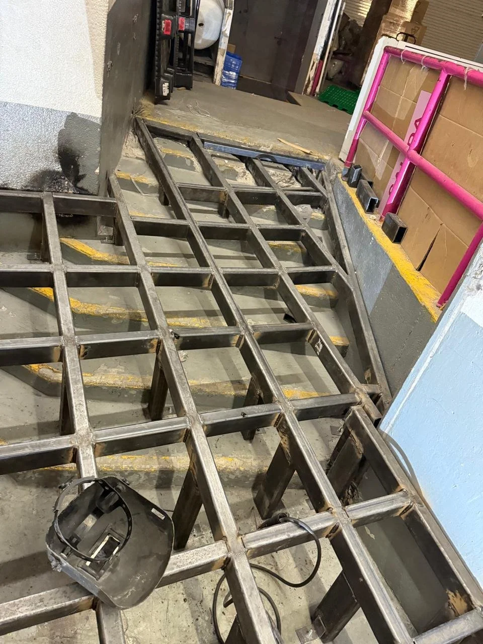 Estructura metálica en un lugar de construcción o reparación, con herramientas y materiales alrededor.