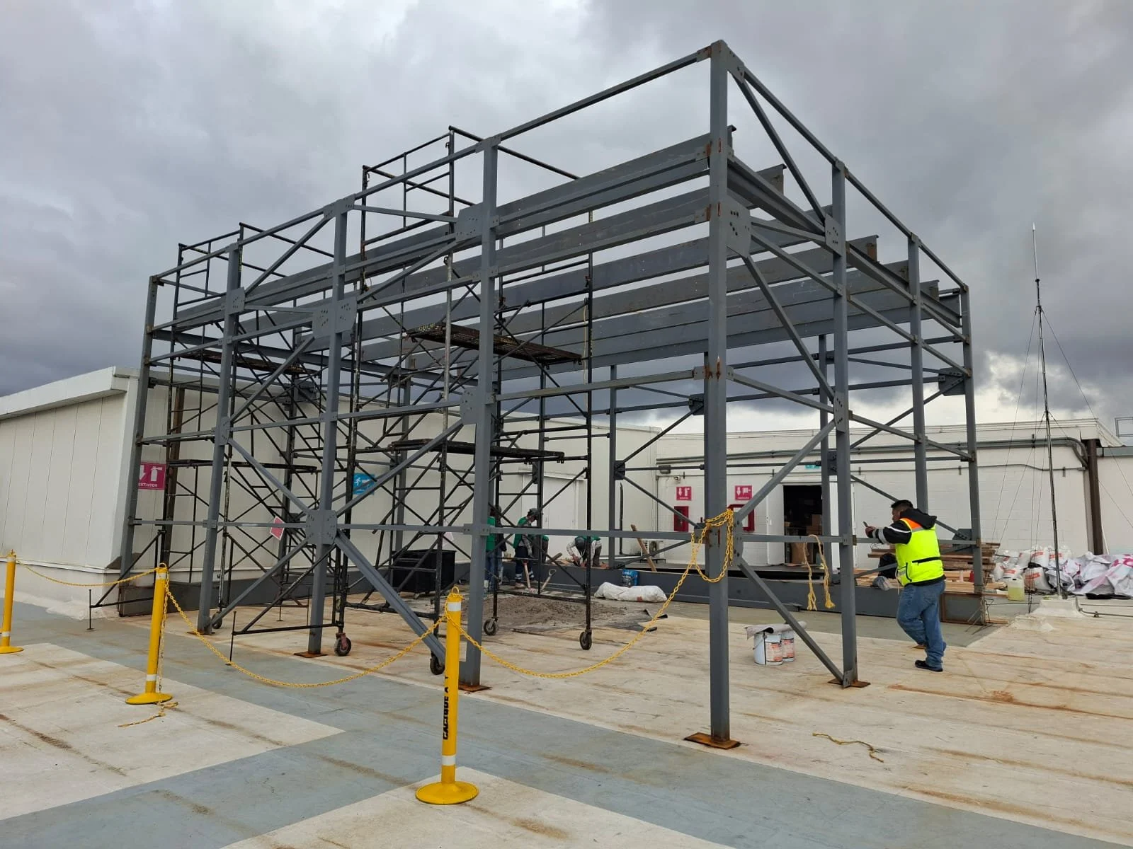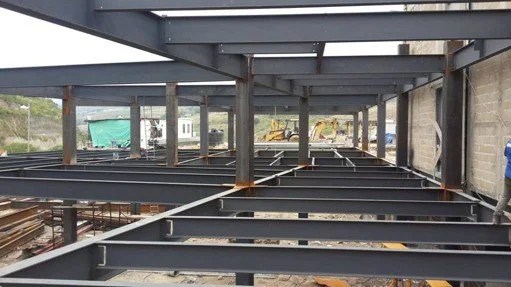 Estructura metálica en construcción con soportes grandes y escaleras de andamiaje.