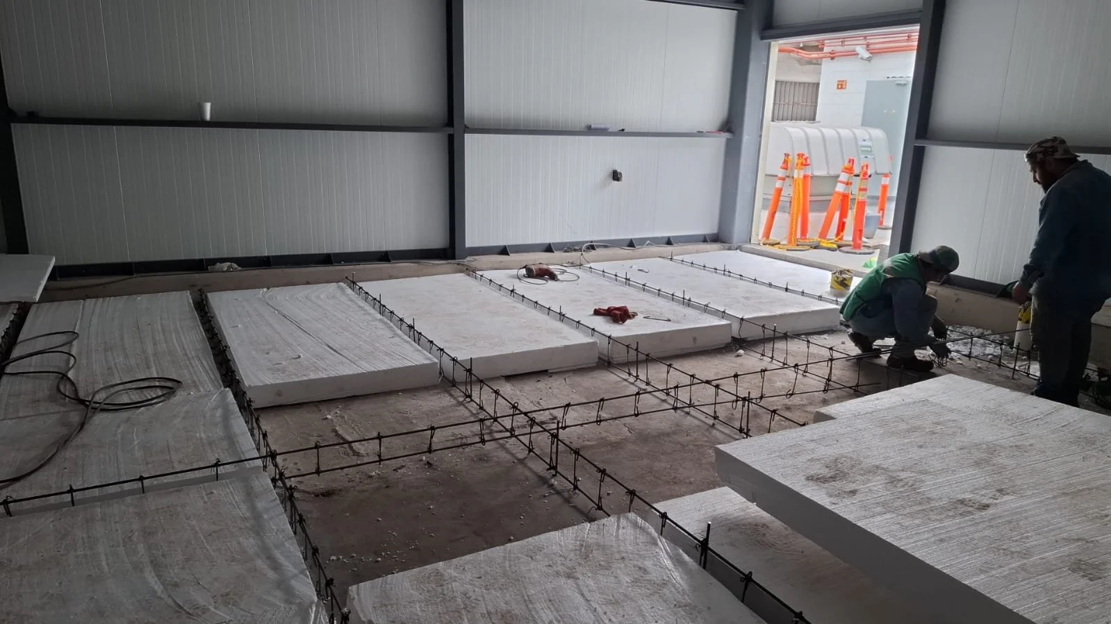 Construcción de una base de concreto en un interior de edificio con dos trabajadores colocando armadura y bloques de material aislante.